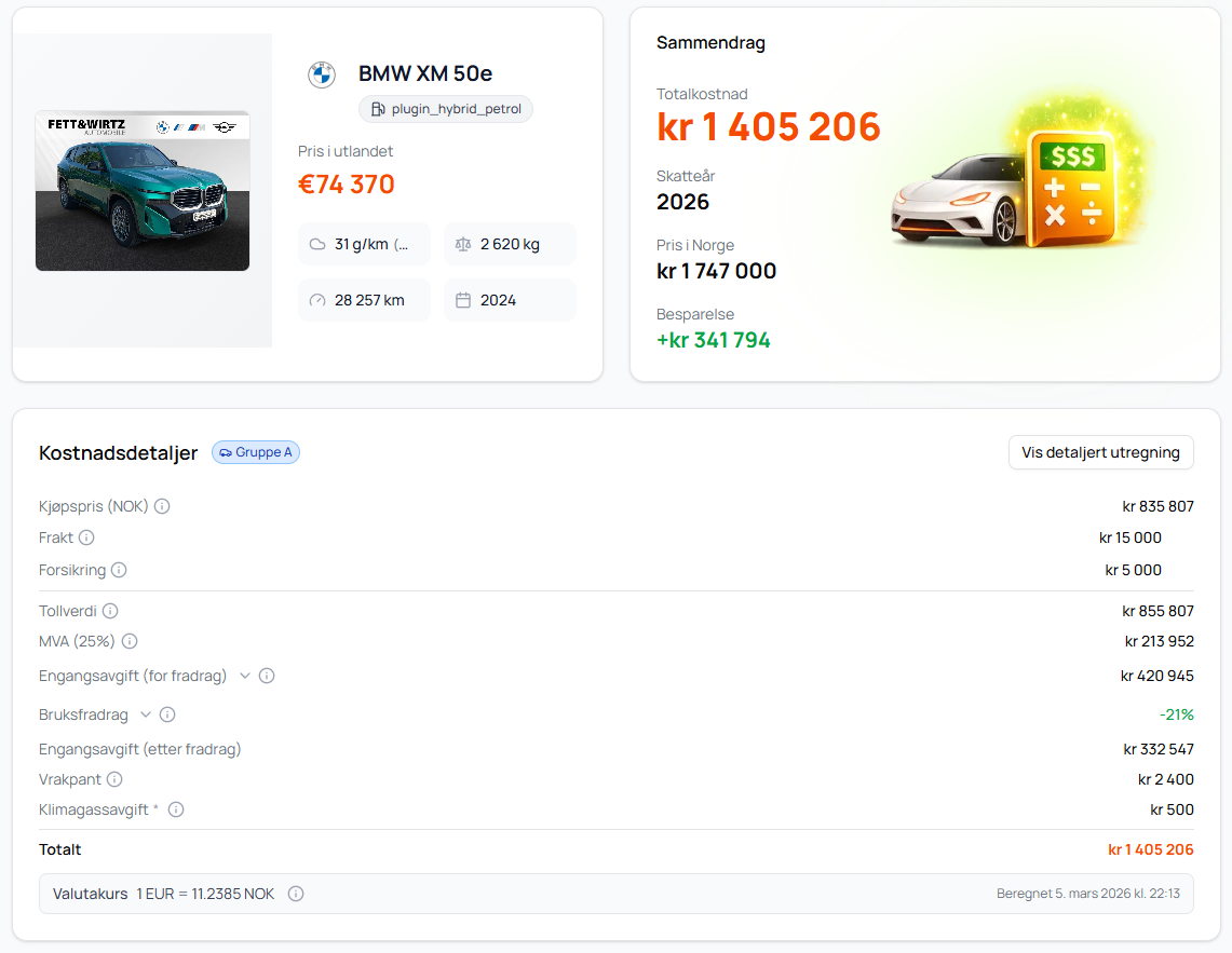 Mot en norsk forhandlerpris på 1 750 000 kroner er det en potensiell innsparing på over 340 000 kroner – og det før eventuell forhandling! Disse tallene er illustrerende; nøyaktige tall avhenger blant annet av registreringsdato, nøyaktig kjøpspris og valutakursen på betalingsdagen. Det er nettopp derfor det kan være lurt å kjøre beregningen i importkalk før du bestemmer deg for noe som helst.