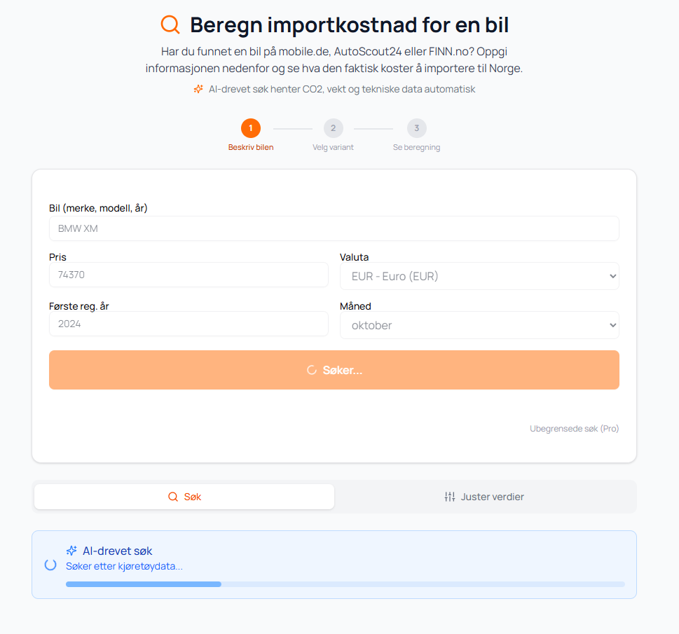 Det aller første du bør gjøre, er å kjøre en beregning i importkalk. Søk opp bilmodellen du er interessert i, og systemet henter automatisk tekniske spesifikasjoner fra databasen – vekt, CO2, drivstofftype og mer. Kalkulatoren bruker oppdaterte satser for 2026 og tar hensyn til aldersbasert bruksfradrag, valutakurs og alle kostnadskomponenter.