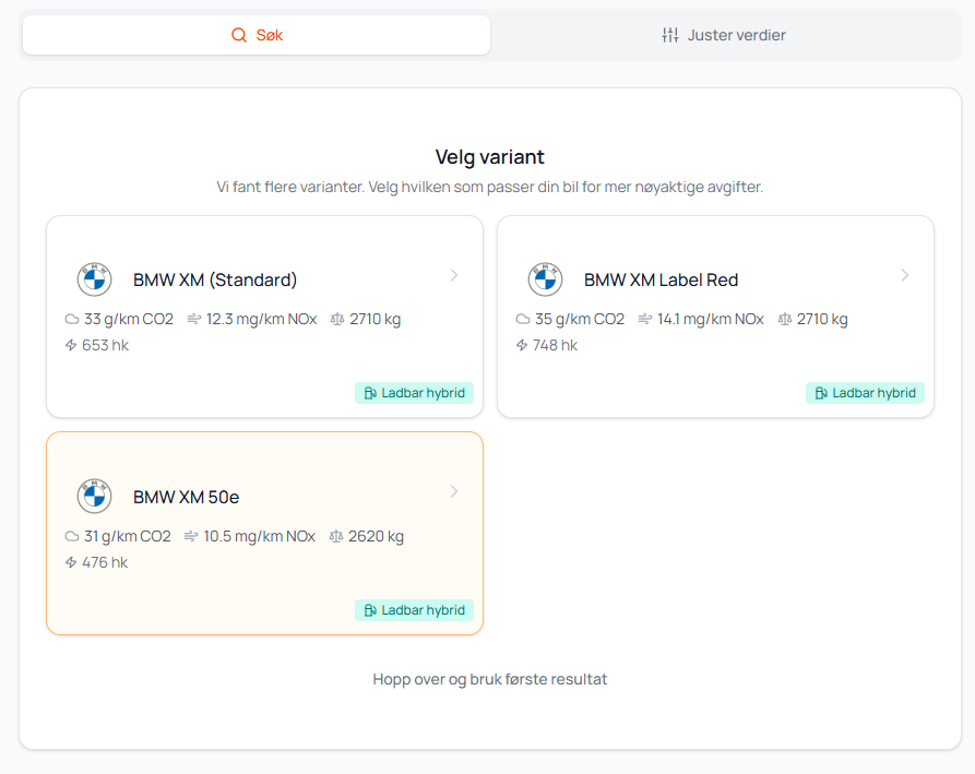 Etter søket er gjennomført, får du opp ulike varianter for den gitte bilmodellen. Velg den som passer bilen du ser på. Du har mulighet å endre utslipp og kjøretøysdata på «juster verier»