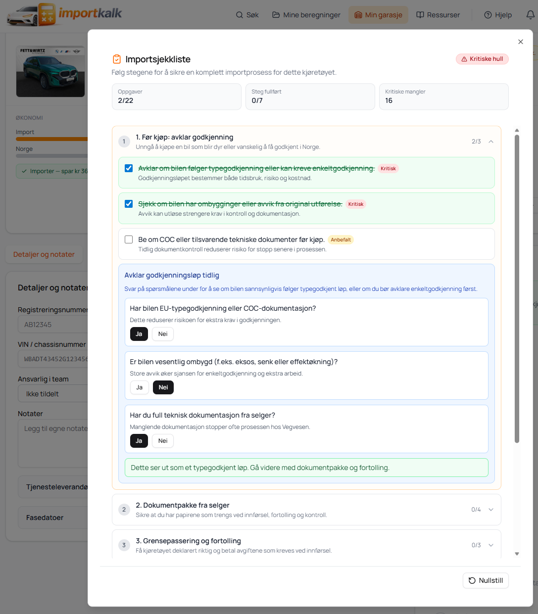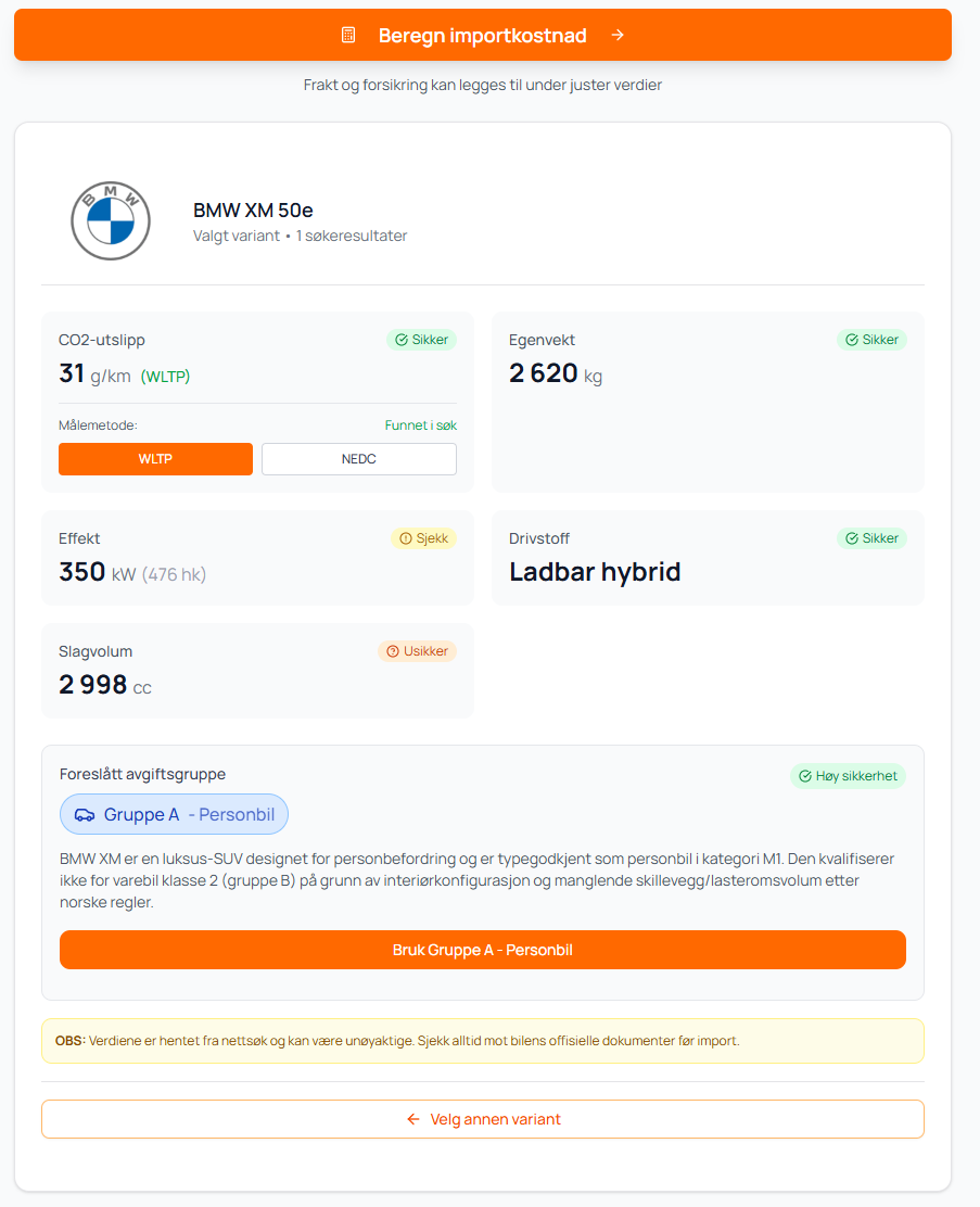 Har du allerede funnet en bil du liker? Gå rett til importveiviseren i Ressurser-fanen og følg sjekklisten steg for steg. Da er du godt rustet, enten du importerer BMW XM eller noe helt annet.