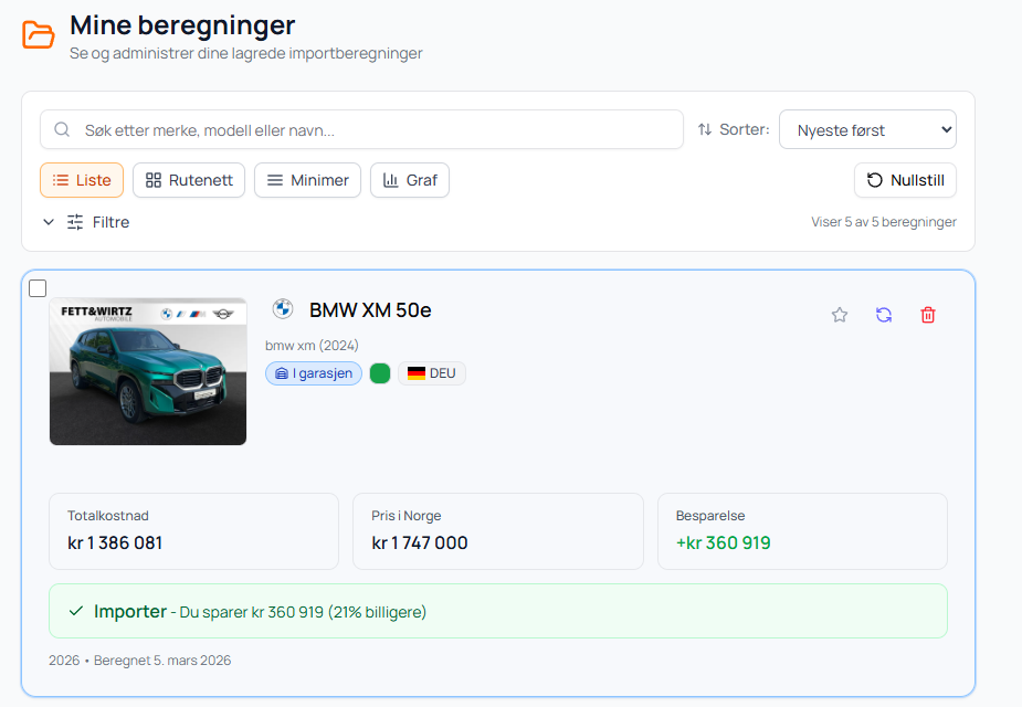 Lagre beregningen under "Mine beregninger", og bruk sammenligningsfunksjonen til å se nøyaktig hva du sparer sammenlignet med norsk pris. Du kan også lagre og sammenligne flere biler side om side – for eksempel en BMW XM mot en BMW X7 – slik at du finner det mest lønnsomme alternativet.