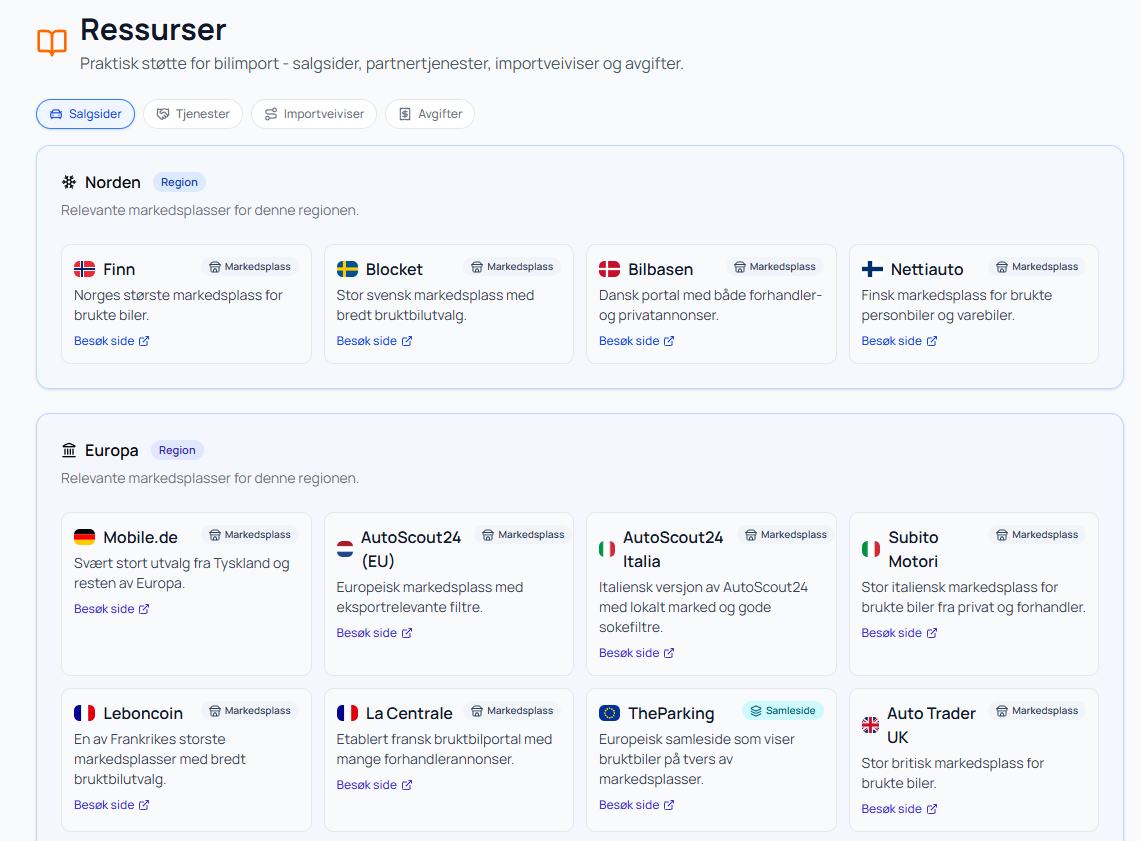 Ressurser-fanen samler det meste du trenger på ett sted: lenker til markedsplasser i Tyskland og resten av Europa, oversikt over partnertjenester innen transport, forsikring og finansiering, og en detaljert avgiftsguide som forklarer det norske systemet fra bunnen av.